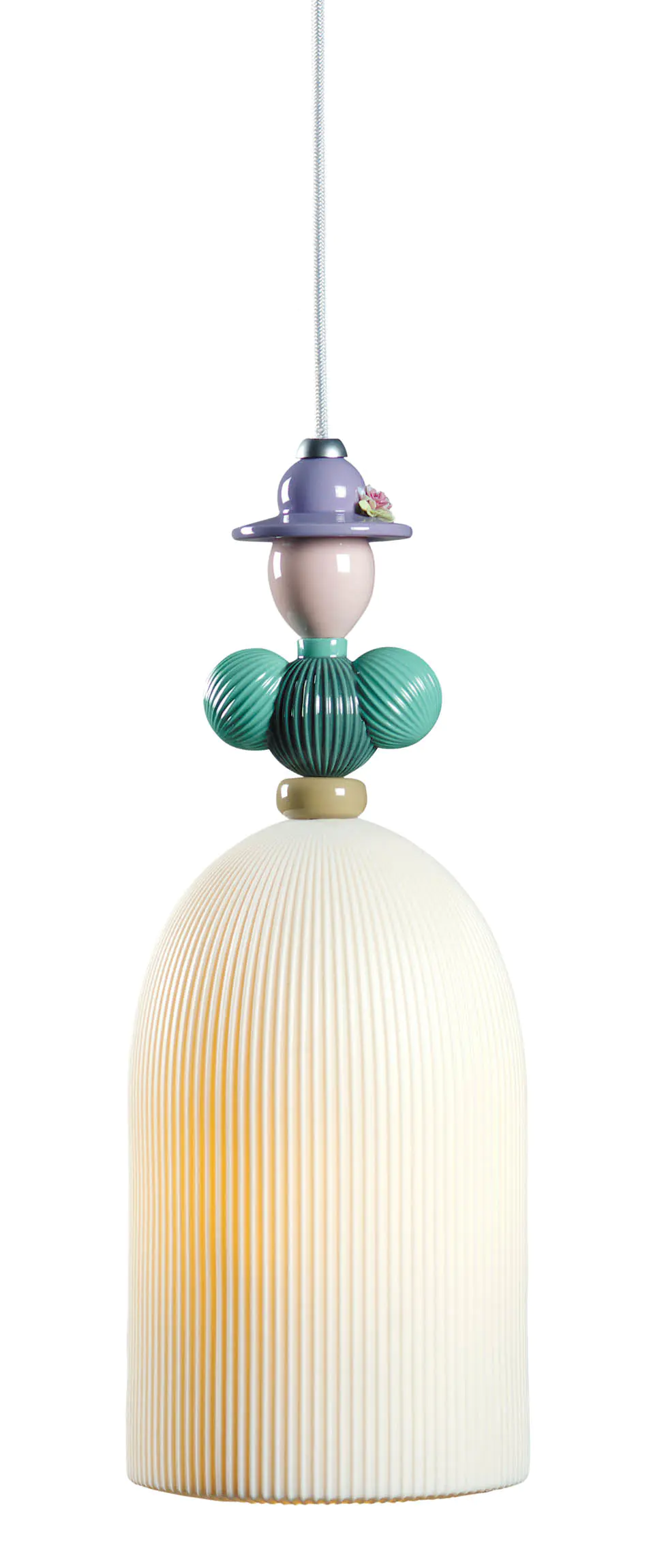 The Mademoiselle collection is inspired by Lladró's romantic ladies, one of his most traditional motifs, to create contemporary and daring designs, full of color. The pieces combine opaque and translucent porcelain; white and colored, with matte and glossy parts. Mademoiselle Daniela is a hanging lamp of one light.