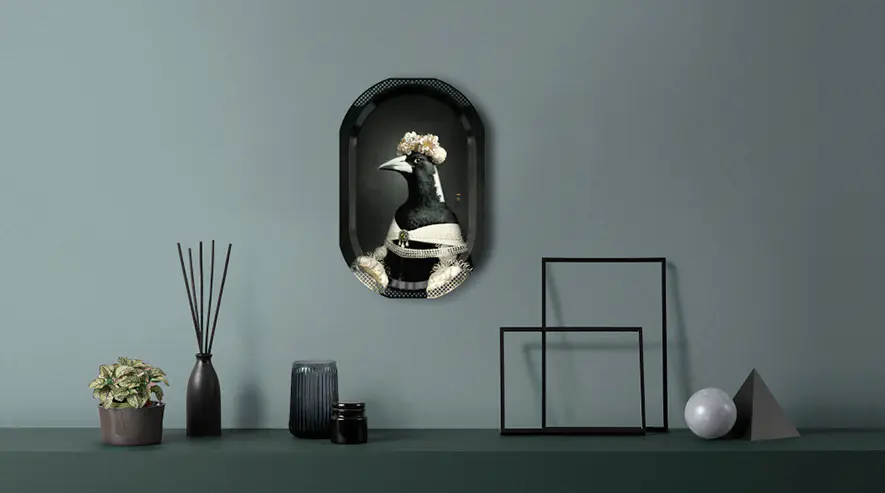 Chatty and talkative, La Pie, wearing a rich floral arrangement, catches the eye with her mischievous eye.